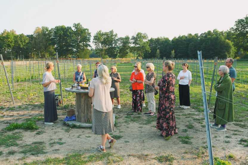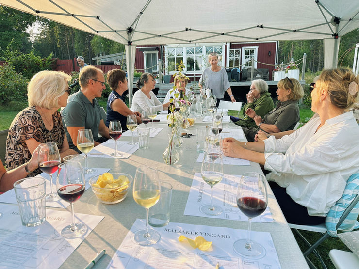 Vi börjar i vingården och jag pratar om hur vi tänkte när vi planterade, vi tittar på plantorna och pratar om skottgallring, gödning, beskärning m.m. Sen går vi upp till restaurangen och häller upp vin som några av mina branschkollegor producerat. Jag fortsätter berätta om vilka val man kan göra i vingården och sedan i vineriet för att få till olika sorters vin.